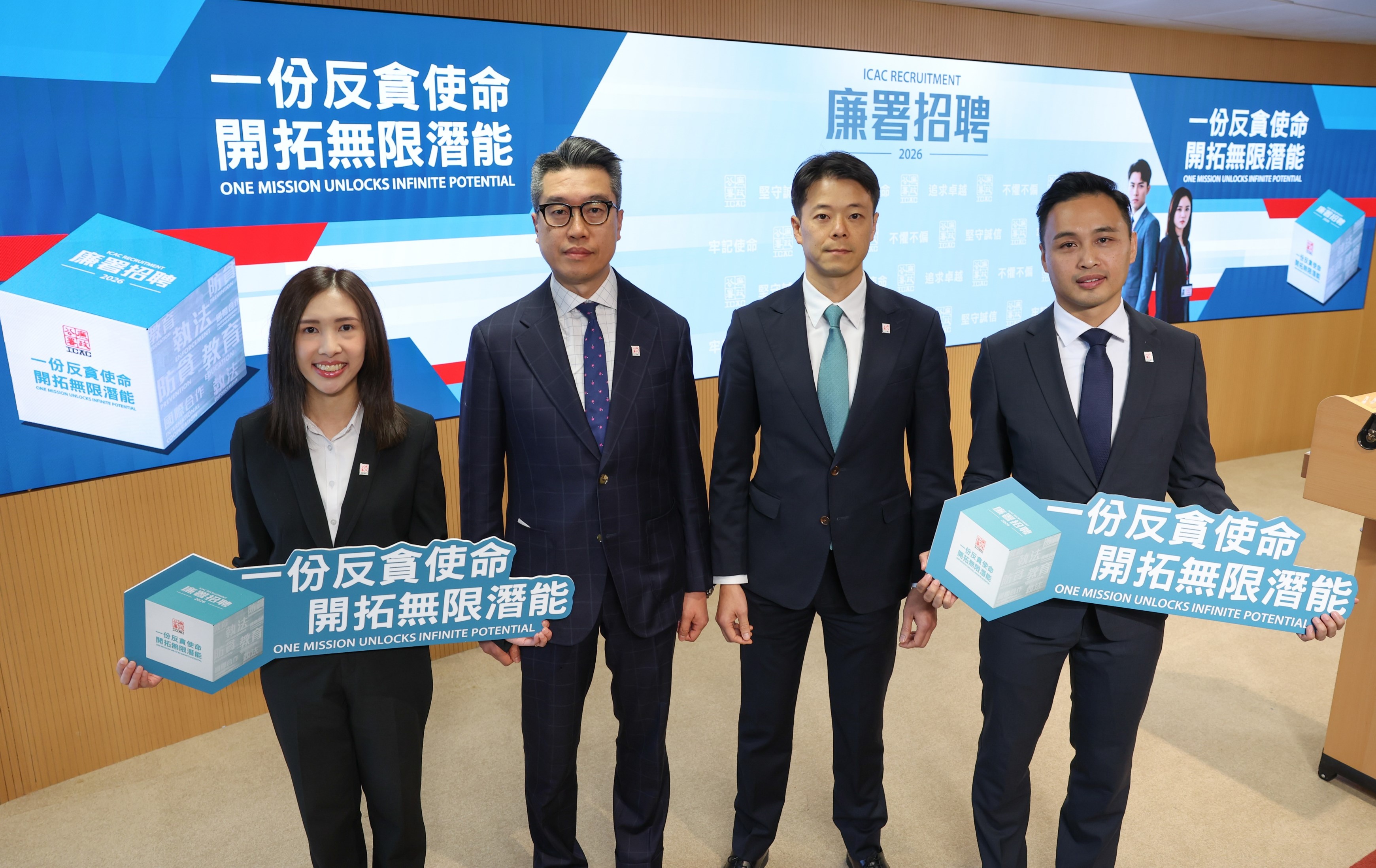 廉署現正以「一份反貪使命 開拓無限潛能」為主題進行新一輪招聘,透過「一體化招聘 全方位培訓」革新人才發展策略,為轄下部門統一招聘及培訓廉政主任及助理廉政主任以填補空缺,截止申請日期為3月23日。「廉署招聘2026」網頁: