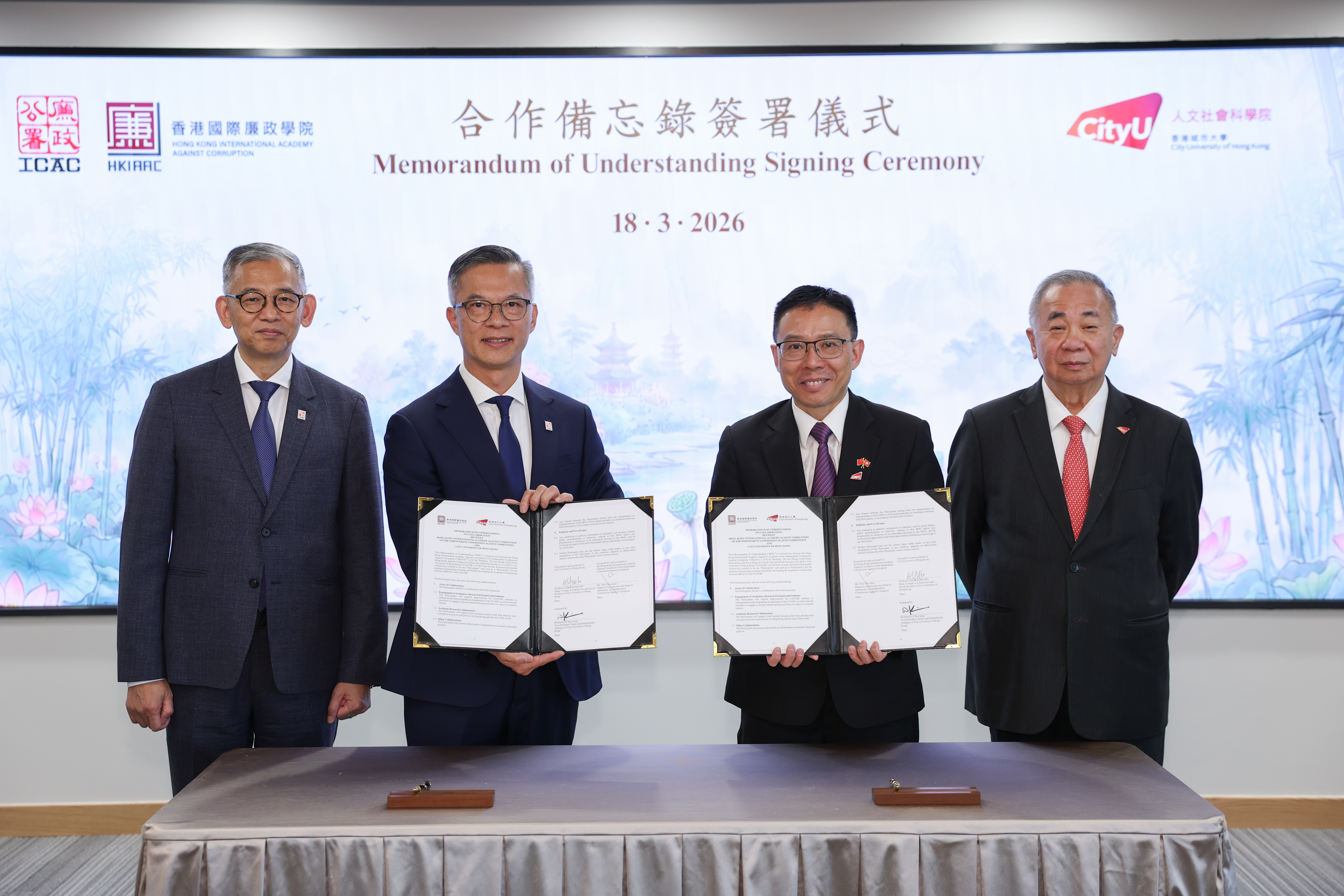 合作備忘錄由副廉政專員兼執行處首長丘樹春及城大人文社會科學院院長何達基教授簽署,並由胡英明和梅彥昌校長見證。合作備忘錄涵蓋由學者、研究人員及學生參與反腐倡廉項目及雙方進行反腐學術研究等事宜。