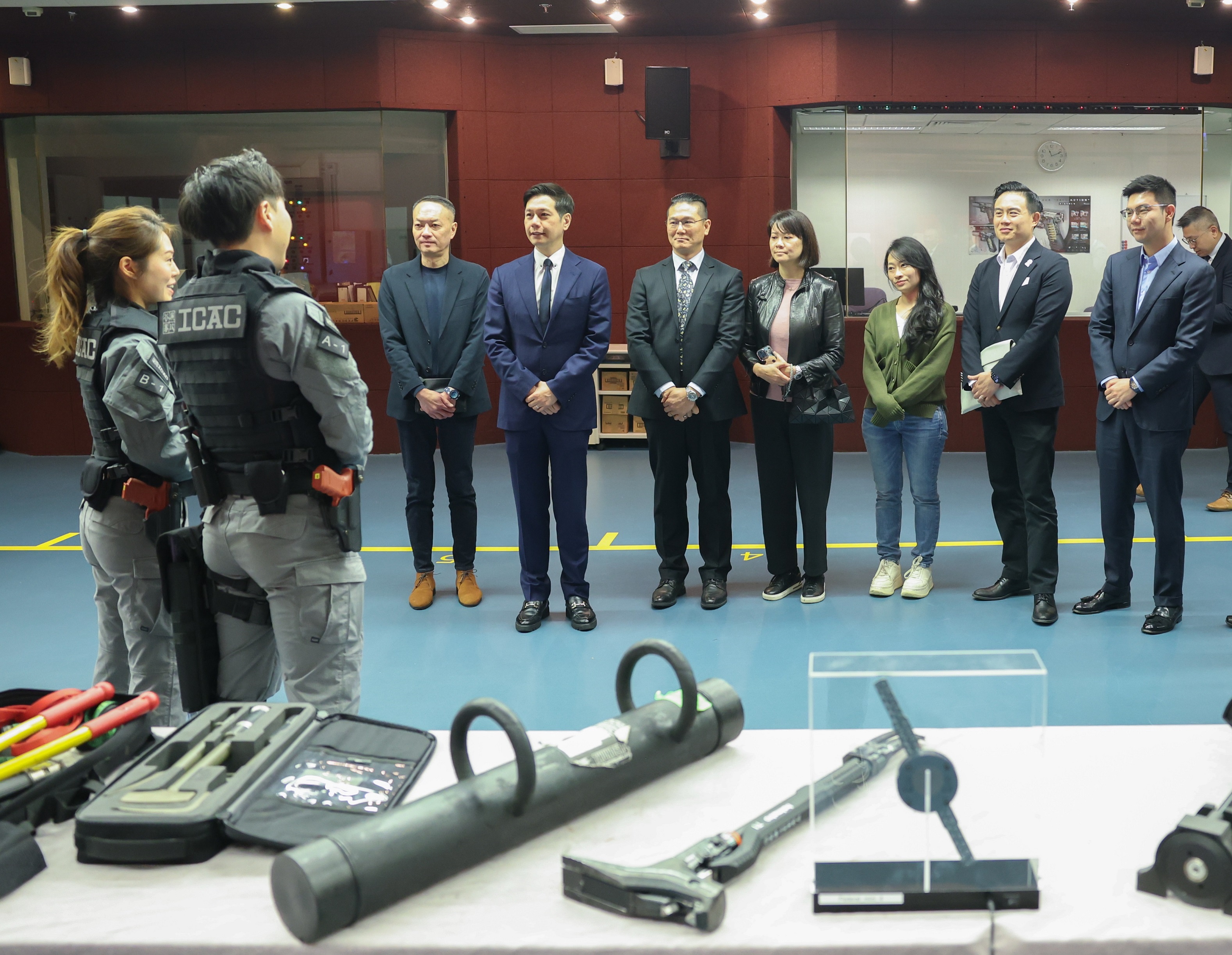 立法會議員亦參觀多項廉署設施,包括舉報中心、拘留中心、電腦資料鑑證組、法證會計組和專責調查上市公司貪污罪行的組別,進一步了解廉署人員應用人工智能技術到日常調查工作和最新電子蒐證程序,及廉署應對商業機構貪污罪行的調查工作。議員亦到訪廉署室內射擊場,觀察廉署的槍械配備和了解配槍人員執行職務的訓練。