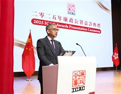 廉政專員胡英明今日(3月10日)主持2025年廉政公署嘉許典禮,表揚廉署人員忠於使命、竭盡所能,並向香港國際廉政學院(廉政學院)國際培訓中心人員及三名廉署人員頒發廉政專員嘉許狀。